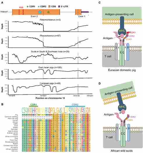 中国科学院昆明动物所张亚平院士团队发挥对非合作优势,联合国际家畜研究所和尼日利亚国家公园管理局等研究力量,运用三代长片段测序技术,构建了普通疣猪(Phacochoerus africanus)和红河猪(Potamochoerus porcus)的高质量基因组。同时,依托西南家猪分子育种与转化医学研究基地,研究团队还构建了高质量的滇南小耳猪参考基因组。通过系统比较非洲野生猪科动物与欧亚家猪基因组的精细结构,发现非洲猪科动物共同祖先支系上产生的结构变异和选择信号与T细胞免疫、病毒感染和淋巴组织发育相关。其中,体细胞重排后参与编码T细胞受体的TRBV27基因在非洲猪科动物中存在284 bp缺失,导致相关T细胞受体缺乏CDR1编码区,影响其T细胞受体对抗原呈递细胞的识别,这可能与对非洲大陆上古老病原的免疫应答相关。研究人员对此前报道的与ASFV抗性相关的CD163和RELA基因进行了深入分析,与对ASFV易感的欧亚家猪相比,非洲猪科动物的这两个基因并未受到选择或表现出快速进化的信号。本研究表明非洲猪科动物的基因组资源有助于筛选家猪受ASFV感染和致病的关键基因,为家猪抗病育种提供关键理论依据和技术支撑。