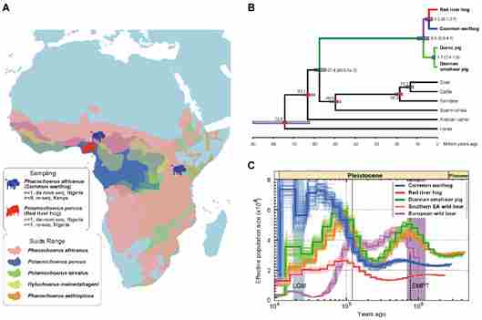 图 1 非洲猪科动物的地理分布、系统发育关系与群体历史动态