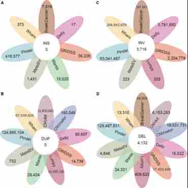 图 1不同工具的对不同类型的SVs的检测一致性评估 (A) INS, (B) DUP, (C) INV以及(D) DEL.