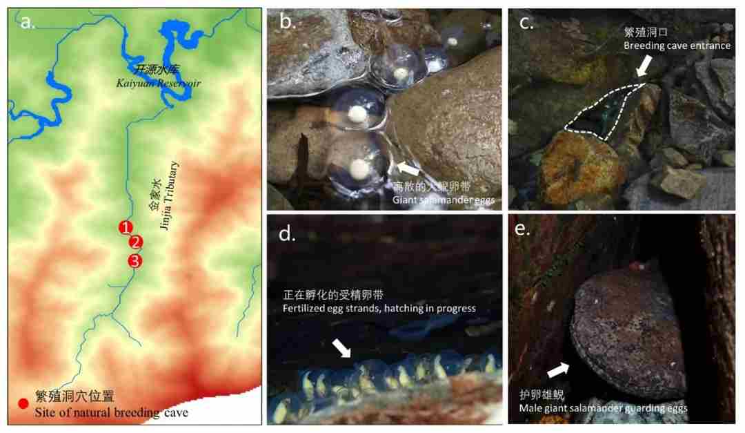 图4 江西大鲵繁殖场监测。(a. 不同年间发现的大鲵繁殖洞穴, 红色实心圆是其发现位置, 数字序号1, 2, 3分别是2021、2022及2023年发现的繁殖洞穴; b. 雌性大鲵产卵后, 带离出繁殖洞外的卵带; c. 发现繁殖洞穴位于一个小回水湾, 洞口开口狭小; d. 观察到发育良好的大鲵胚胎; e. 护卵的雄鲵, 守在洞口, 防止入侵者打扰)
