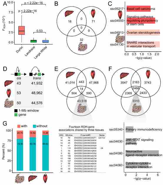 为了理解家猪近交衰退的遗传基础,本研究整合了大量公共数据,评估了ROH对经济性状、基因表达和个体存活的影响。研究发现,ROH显著影响阴囊疝易感性和生长性状,基因表达层面的近交衰退存在组织特异性(图1)。同时,本研究利用ROH缺失在中畜五指山小型猪近交系中推断了隐性纯合致死突变,发现相关突变主要富集到嗅觉受体基因。相关研究成果为家猪的育种工作提供了参考。