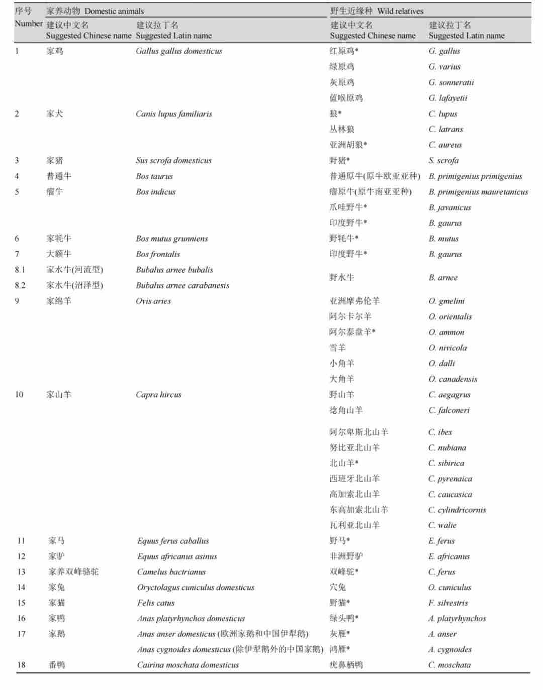 然而,家养动物及其野生近缘种的中文名和拉丁名的使用混乱,阻碍了战略生物资源的准确鉴定,影响了有效的科研交流和科普宣传,并容易造成重要战略生物资源的流失。而正确使用家养动物及其野生近缘种的中文名和拉丁名,对保护和研究畜禽遗传资源及野生资源有重要意义。尽管家养动物的拉丁学名的使用多次被讨论,但目前仍缺乏统一标准。家养动物与其野生近缘种的中文名的使用则鲜少有讨论。