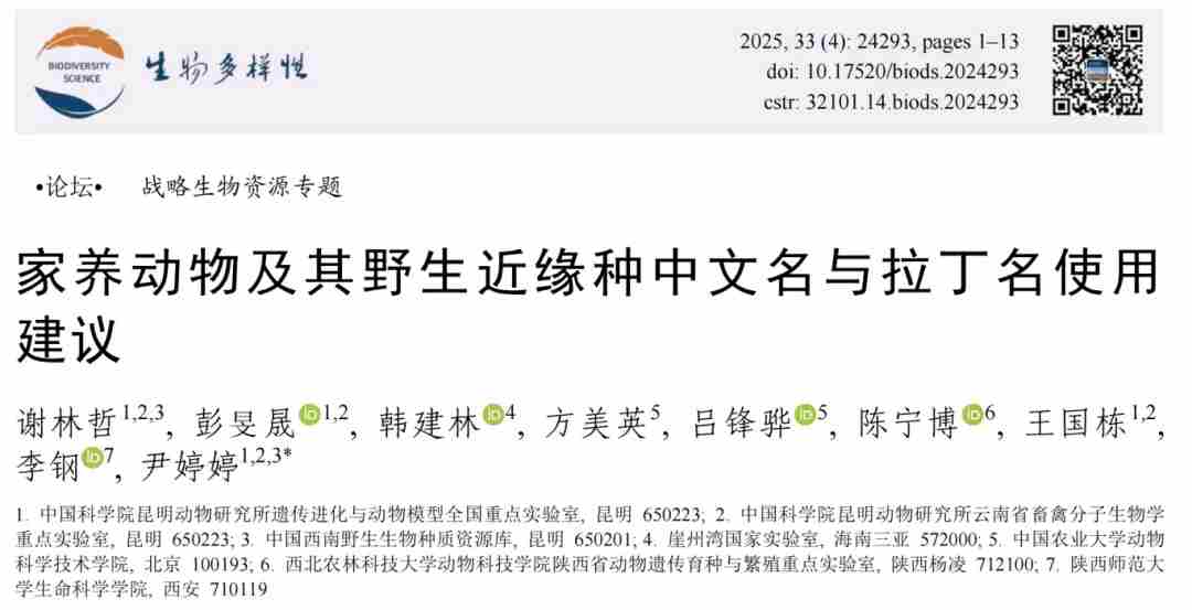 《家养动物及其野生近缘种中文名与拉丁名使用建议》一文通过检索国内外相关文献、网站,调查了家养动物驯化起源历史最新的研究进展,着重分析了家养动物及其野生近缘种的中文名、拉丁名、英文名的来源和使用情况,并结合《国家重点保护野生动物名录(2021)》、中国生物多样性红色名录(2021)、《濒危野生动植物种国际贸易公约(2023)》等官方文件和学术报告的有关物种名称的使用情况,梳理了主要家养动物及其野生近缘种的名称在这3种语言间的对应关系,在此基础上提出了适合国内使用的18种主要家养动物的中文名和拉丁名的使用建议(表1)。