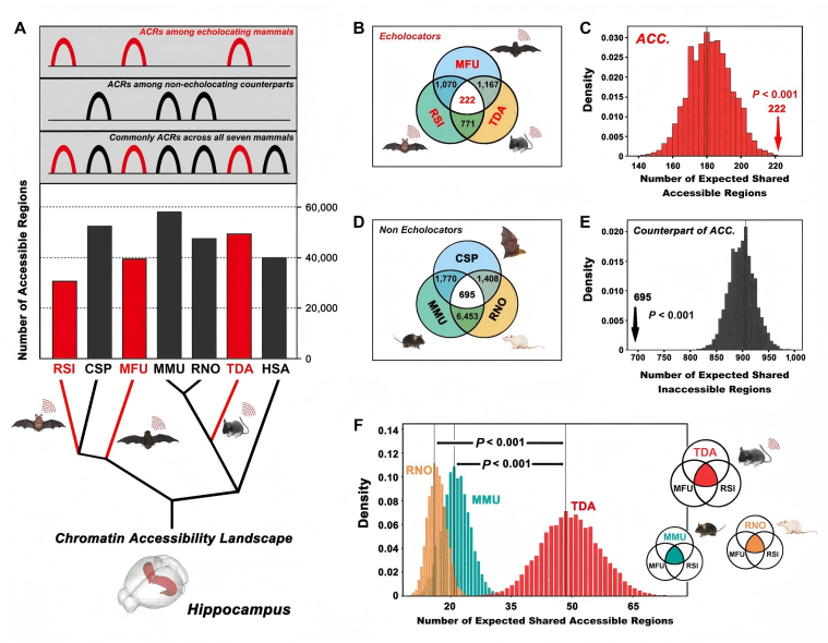研究团队创新性地整合染色质可及性测序(ATAC-seq)、转录组测序(RNA-seq)和透射电镜等多维技术手段,系统比较了中华菊头蝠、普通长翼蝠等回声定位蝙蝠与大娄山猪尾鼠的海马区基因调控特征。研究发现,尽管这些物种分属不同哺乳动物类群且独立演化出回声定位能力,但其海马区存在222个共享的开放染色质区域(ACRs),这一数量显著高于随机预期。尤为重要的是,这些共享ACRs在回声定位物种中促进形成了更为复杂的基因调控网络,并与突触可塑性相关通路密切相关。进一步的,研究团队通过高分辨率透射电镜观察到,猪尾鼠海马区的突触密度和线粒体密度均显著高于实验室小鼠,这一结构特征与基因调控网络预测的功能强化高度一致。更具突破性的是,研究首次发现传统听觉相关基因(如SLC26A5、OTOF等)在海马区调控网络中异常活跃,暗示这些基因可能还参与了空间定位等新功能的构建。