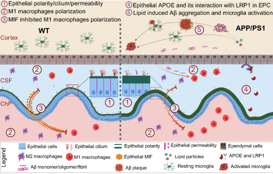 图1. 脉络丛病理异常促进阿尔茨海默病(AD)的发生与发展。AD模型小鼠的脉络丛在受到来自脑实质的Aβ刺激后,其纤毛结构、上皮细胞极性及屏障通透性均发生病理性改变。同时,AD小鼠脉络丛上皮细胞分泌的巨噬细胞迁移抑制因子(MIF)减少,导致脉络丛巨噬细胞活化。这些活化的巨噬细胞及其他脉络丛细胞通过分泌APOE等配体,调控室管膜细胞的脂质转运功能,最终引发脑实质脂质积累与小胶质细胞活化。