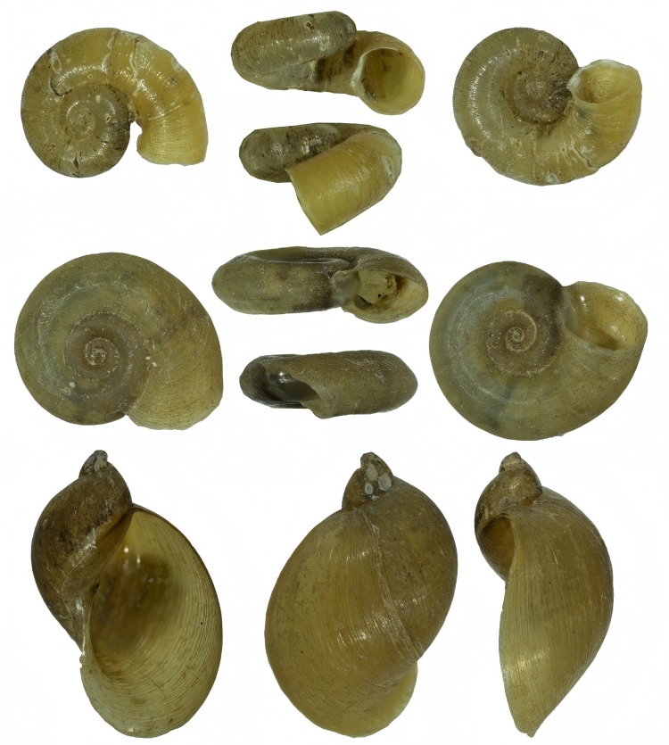 此次发现的三个碧塔海特有新种为盘螺科的碧塔盘螺(Valvata bitaensis)、扁蜷科的日月旋螺(Gyraulus semskyinyizla)和椎实螺科的中甸萝卜螺(Radix shangrila),各个新种的有效性均得到了贝壳形态、壳表超微结构、外套膜解剖特征和线粒体分子标记COI的强烈支持。碧塔盘螺的壳口与体螺层分离,经常形成解旋形态,是泸沽湖特有种琥珀盘螺的姐妹群。日月旋螺具有独特的粗糙壳皮以及密布细点状色斑的外套膜,是继泸沽湖的泸沽旋螺和滇池的刑天旋螺之后发现的第三个现生扁蜷属云南高原湖泊特有种。萝卜螺属在云南高原湖泊中具有极高的多样性和特有性,但是几乎都没有被正式描述,中甸萝卜螺是云南高原湖泊特有萝卜螺属中首个被正式命名的物种,可以通过独特的轴唇形态和外套膜色素分布进行鉴定。