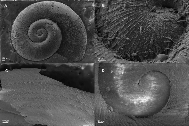 碧塔盘螺(A-B)和日月旋螺(C-D)壳表的超微结构