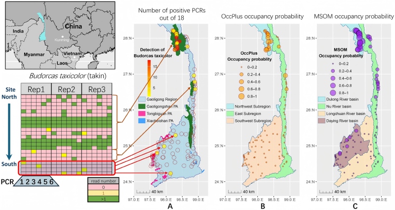 图1 OccPlus模型与原始检测数据、传统多物种占域模型(MSOM)在校正eDNA数据错误上的对比(以贡山羚牛为例)。左图表格展示了样点中检测到贡山羚牛的原始PCR数据,颜色深浅代表DNA序列数量(图中A)。OccPlus模型的先进算法能够识别出高黎贡山南部的4个弱信号检测(如18次PCR仅1次阳性)为假阳性,从而精准地重现了贡山羚牛仅分布于北部的真实格局(图中B)。相比之下,传统的MSOM模型则无法有效校正此类错误(图中C)。