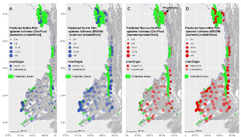 图2 本土与外来鱼类物种丰富度的空间格局。该图对比了OccPlus(A, C)与MSOM(B, D)两种模型对本土鱼类(蓝色)和外来鱼类(红色)物种丰富度的预测结果。OccPlus模型更清晰地揭示了鱼类多样性由北向南递增的地理梯度,并精准锁定了由人类活动驱动的局部入侵“热点”—丙中洛。