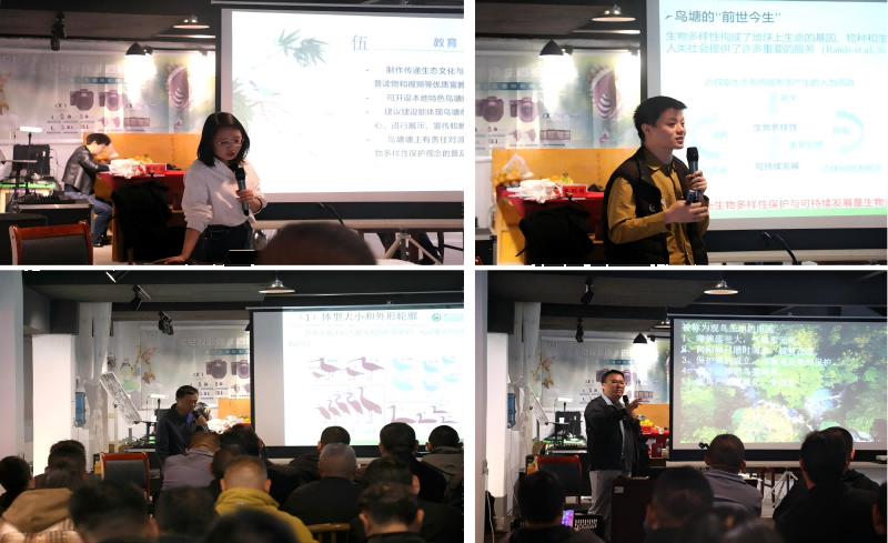 本次会议以“管好鸟·观好鸟”为主题,围绕鸟塘观鸟的建设规范、综合生态影响评估及鸟类识别方法等关键议题展开深入交流和探讨。 鸟类学研究组的胡远芳和何林在会上重点分享了鸟塘建设管理的初步框架及鸟塘综合生态评估成果,为鸟塘观鸟提供了科学依据,岩道工程师进行鸟类识别的培训,旨在提升鸟塘塘主、观鸟导赏员以及生态保护相关人员的专业能力,增强观鸟体验。同时,百花岭作为中国第一家建设鸟塘的典范,鸟塘塘主代表总结了其多年来的实践经验和挑战,为与会者提供了宝贵的借鉴。