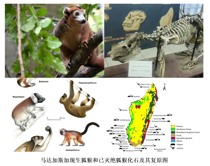 鲜为人知的是,如今五彩缤纷的5个科110多种狐猴背后,隐藏了近代大量灭绝的事件。据考古记录和化石记载,大量的大体型狐猴,如巨狐猴属(Megaladapis)、中狐猴属(Mesopropithecus)、猿狐猴属(Archaeolemur)、厚狐猴属(Hadropithecus)、古原狐猴属(Palaeopropithecus)和巴伯考西亚狐猴属(Babakotia)等,两千年以来遭到了灭绝,其中巨狐猴(Megaladapis edwardsi)的体重可达80-160千克,而现生最大的狐猴-印得里狐猴(Indri indri)的体重只有6-10千克。不谋而合,据记载,约7-8千年前源自中国东南沿海地区的南岛语族人群,经由台湾岛和东南亚群岛,约两千年前扩散和定居到了马达加斯加岛,成为这里最早的居民。而后500年,来自非洲大陆的班图语系人群也来到了这里。除此之外,鲜有考古证据表明这里曾经存在过早全新世的狩猎-采集者。总之,马达加斯加是探索近代以来人类活动⇄气候变化⇄生物多样性演变复杂关系机制的“天然实验室”。