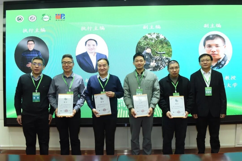 施鹏研究员(左1)和李家堂研究员(右1)为蒋学龙研究员(左2)、李枢强教授(左3)颁发执行主编聘书,中山大学范朋飞教授(右3)、华东师范大学斯幸峰教授(右2)颁发副主编聘书
